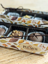 Dark Chocolate: Pistachio Pumpkin Latte Cream, Vanilla Cream, Sea Salt Caramel, our classic English Butter Toffee, & Maple Cream.