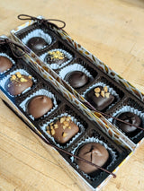 Milk Chocolate: Buttered Rum Coconut Truffle, Vanilla Cream, Sea Salt Caramel, our classic English Butter Toffee and Maple Cream.