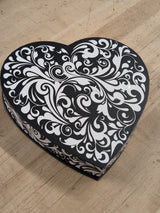 This beautiful heart box is where non traditional meets classic!  Alluring black & white swirls cover the entire box which features 16 ounces of Pulakos Milk & Dark Chocolates including caramels, creams, nuts, truffles, and more.  This box is a Staff Pick!