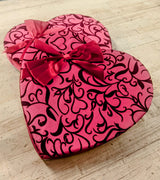 A delicious sample of Pulakos Milk and Dark chocolates in a 16oz heart shaped box. Heart box is red satin with velvet and satin bow.